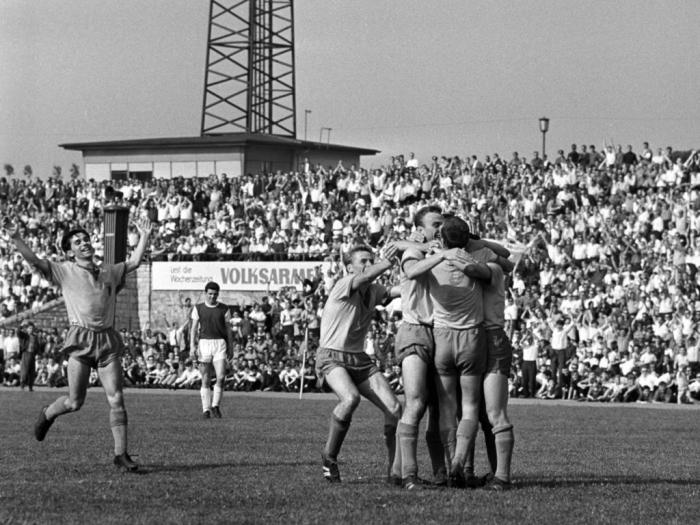 À l’Est en revanche, le football n’est clairement pas à la fête. Bien que son équipe nationale soit créée dès 1952, des insurrections populaires l’année suivante vont bloquer l’ensemble du pays durant plusieurs mois. Tous les rassemblements de masse, y compris les événements sportifs, seront interdits. Ce n’est qu’après la répression sanglante orchestrée par le régime communiste que la sélection nationale retrouvera le terrain en 1954. Le retard pris face à son voisin est toutefois déjà important. Les dirigeants de la RDA vont alors intensifier le contrôle étatique des organisations sportives et le football n’y échappera pas.