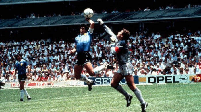 Sur un ballon très mal dégagé et une sortie peu assurée de Peter Shilton, le gardien anglais, Maradona se jette, saute et touche le ballon de la main gauche pour marquer. M. Bennaceur, guidé par son assistant et pourtant impeccable d’un bout à l’autre de cette houleuse rencontre, commet une erreur manifeste ; le but est validé, la ‘Mano de Dios’ (Main de Dieu, des dires du meneur de jeu argentin) est née.