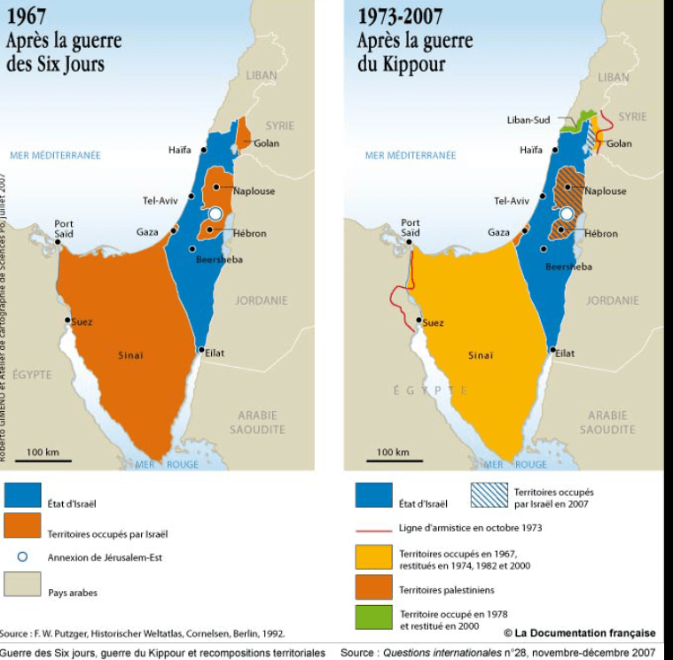 De nouvelles guerres ont lieu en 1967 (Guerre des Six Jours) et 1973 (Guerre du Kippour), avec les victoires d’Israël. Qui va ainsi consolider son implantation, occuper les territoires palestiniens de Gaza et de Cisjordanie et accentuer sa mainmise sur Jérusalem.